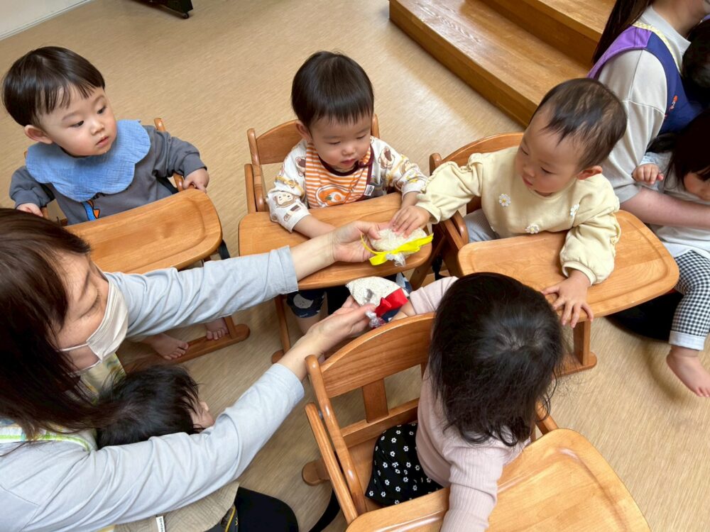 小さいお友だちは、出来立てホヤホヤのおもちを触って感触を楽しんだよ😍
