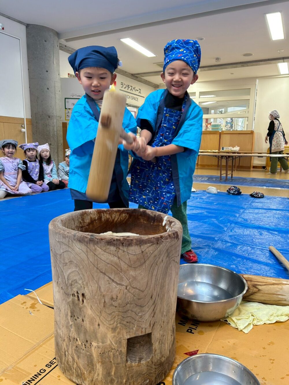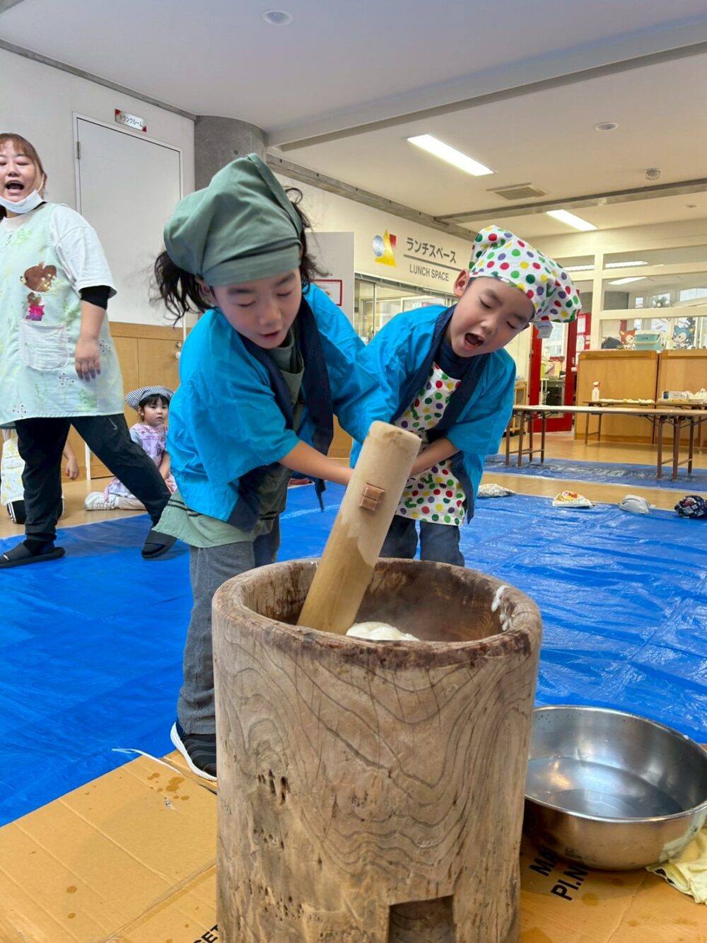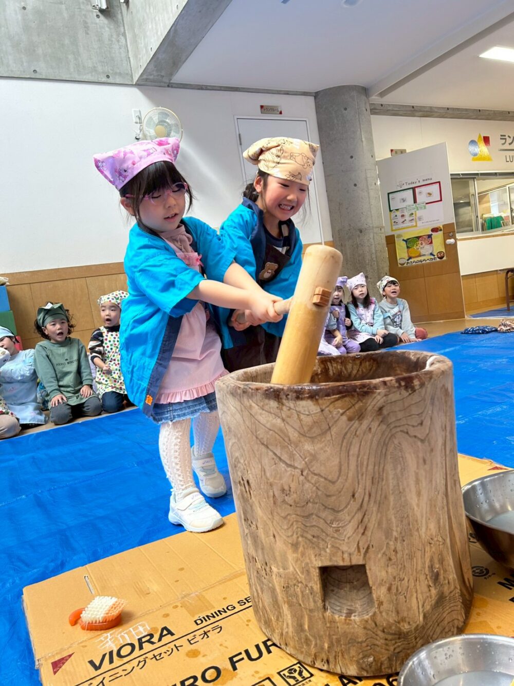 先生からおもちつきをつく時のコツを聞いて、だんぼさんのおもちつきがスタート!!!
