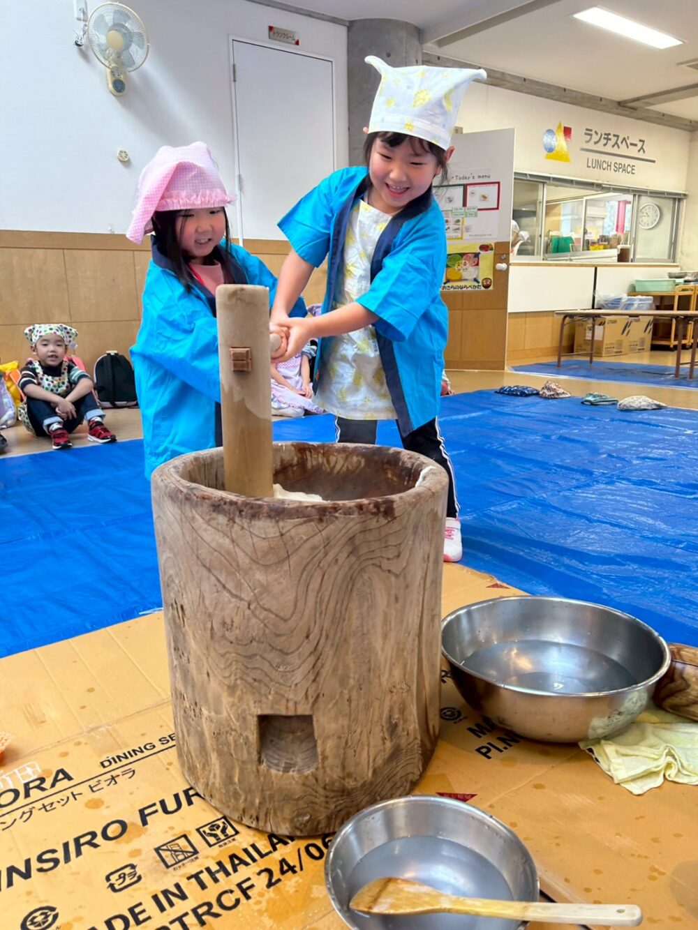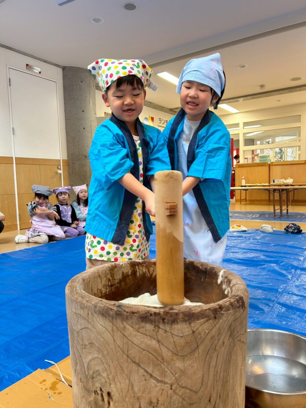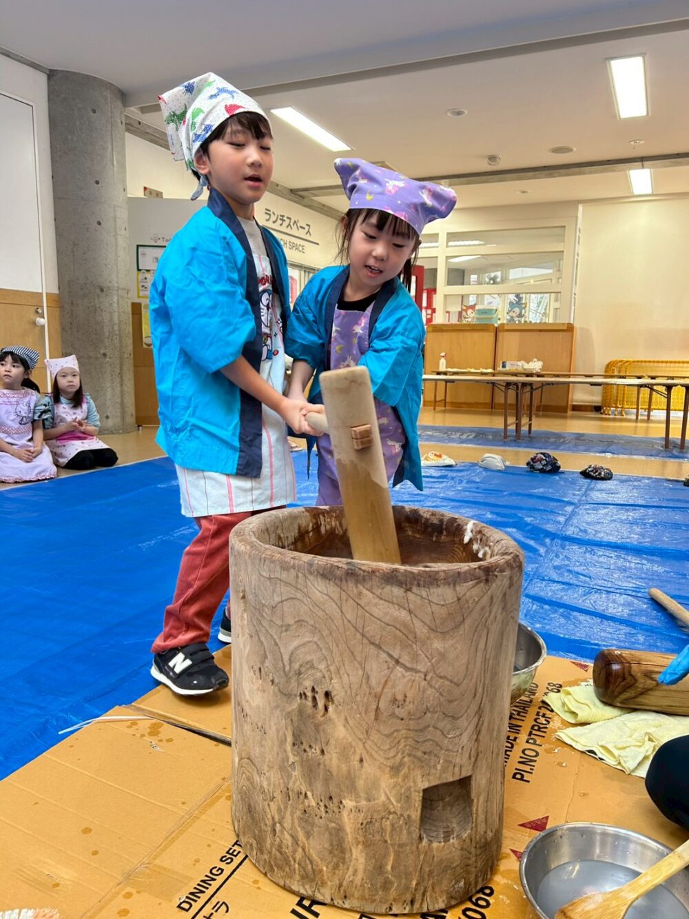 先生からおもちつきをつく時のコツを聞いて、だんぼさんのおもちつきがスタート!!!