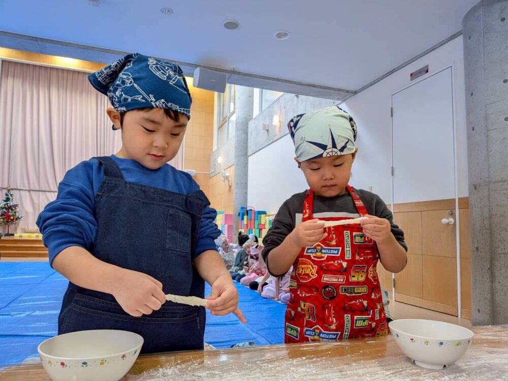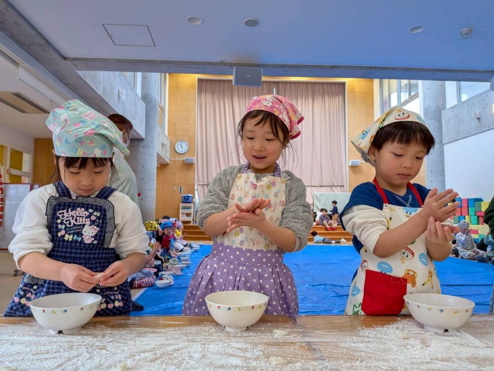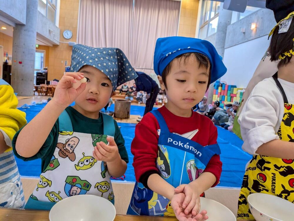だんぼさんがついて出来上がったおもちを大きいお友だちは自分で丸めてみたよ😆
